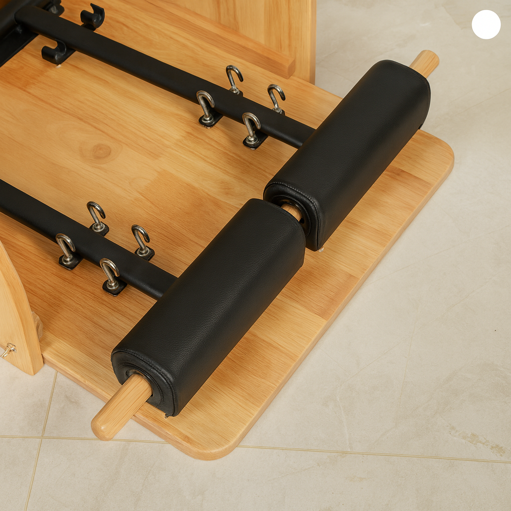 La Chaise de Pilates est un équipement compact composé d’une plateforme et de pédales réglables. Elle permet d’effectuer différents exercices ciblant les jambes, le centre du corps et la stabilité générale. Sa conception polyvalente convient à plusieurs niveaux de pratique.